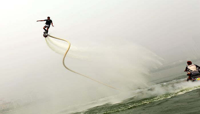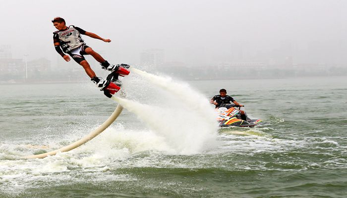 7월17일 오전, 2014중국린이 모터보트 프리스타일 시범 경기 참가 선수들이 이허강에서 워밍업 하고 있다. 이 번 경기는 7월19일,20일 밤 20시—22시 린이 수상 운동 센터—이허강 남호심섬에서 열릴 것이다. 미국, 프랑스, 네덜란드,스웨덴,말레이시아, 중국 및 중국 대만에서 온 8개 국제 팀, 20명 운동 선수, 10개 경기 보트가 참가할 것이다.
