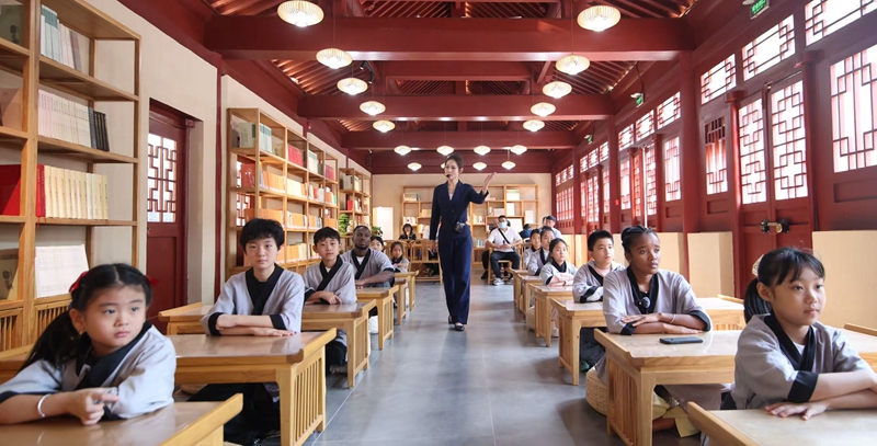 현지 청소년과 린이 대학교 유학생들이 《논어》를 공부하고 있다.