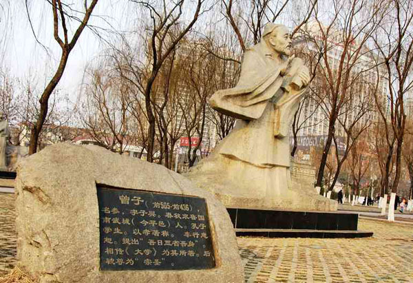 증자,이름은 삼(參, 참이라고 부르기도 함,기원전), 자는 자여(子輿)이며, 산둥성 평이현에서 출생하였다. 공자의 고제(高弟)로 효심이 두텁고 내성궁행(內省躬行)에 힘썼으며, 노(魯)나라 지방에서 제자들의 교육에 주력하였다. 공자가 제자들을 모아 놓고 “나의 도는 하나로써 일관한다(吾道一以貫之)”고 말했을 때 다른 제자들은 그 말의 참뜻을 몰라 생각에 잠겼으나, 증자는 선뜻 ‘부자(夫子)의 도는 충서(忠恕)뿐’이라고 해설하여 다른 제자들을 놀라게 하였다는 이야기는 유명하다.