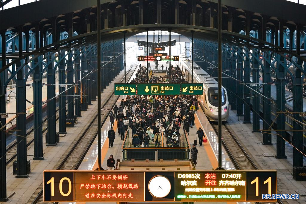 [신화망 베이징 2월 3일] 2일 하얼빈 기차역에서 승객들이 기차를 타기 위해 이동하고 있다.